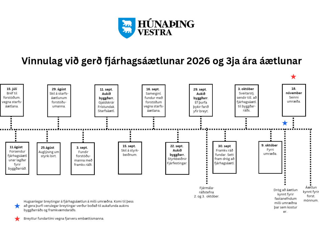 Á þriðjudagsmorgni hófust leikar við borholur Hitaveitunnar á Laugarbakka. Sérfræðingar voru þar við viðhald á aðal borholunni sem reyndist í verra standi en gert hafði verið ráð fyrir. Unnu þeir að viðgerð alla vikuna og tókst að koma henni í gott lag. Á meðan var kerfið keyrt á varaholu. Þegar búið var að koma aðal holunni í rekstur að nýju var varaholan einnig skoðuð og reyndist í ágætu ástandi. Kerfið á þá að vera klárt fyrir veturinn en nauðsynlegt er að viðhalda þessum mikilvægu kerfum vel enda liggja í þeim mikil verðmæti, bæði hjá sveitarfélaginu en ekki síður hjá notendum. Að þeirri heimsókn lokinni fundaði ég með sviðsstjóra fjármála- og stjórnsýslusviðs og sviðsstjóra umhverfis- veitu- og framkvæmdasviðs. Fórum við yfir stöðu fjárfestingaverkefna. Að þeim fundi loknum settist ég niður ásamt síðarnefndum sviðsstjóra og leiðtoga veitna til að ræða stöðu mála í áhaldahúsi og í veitum. Þarft og gott samtal. Því næst fundaði ég með verkefnisstjóra umhverfismála til að fara yfir ýmis mál, meðal annars starfsáætlun hennar fyrir komandi ár en forstöðumenn vinna nú að áætlunum fyrir sínar stofnanir í tengslum við fjárhagsáætlun komandi árs. Vinna við hana er hafin fyrir nokkru enda nauðsynlegt að vera tímanlega í þeirri vinnu sem er nokkuð flókin og tímafrek. Ferlið við fjárhagsáætlunargerðina er orðið þokkalega vel slípað til hjá okkur. Er unnið eftir skipulögðu ferli sem sett er fram myndrænt hér: