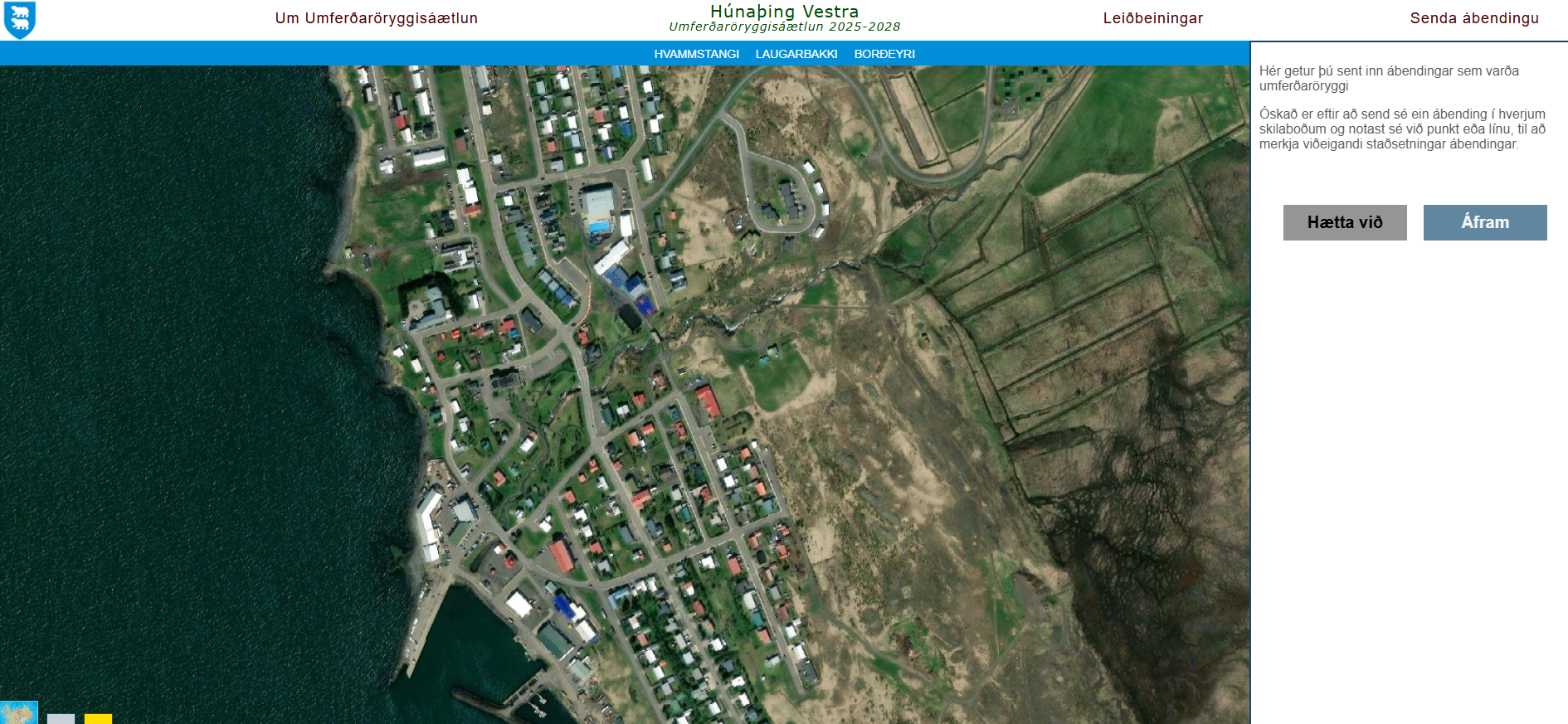 Skjáskot af vefsjánni. Smellt er á Senda ábendingu efst í hægra horninu og kemur þá ábendingaglugginn sem sést á myndinni upp.