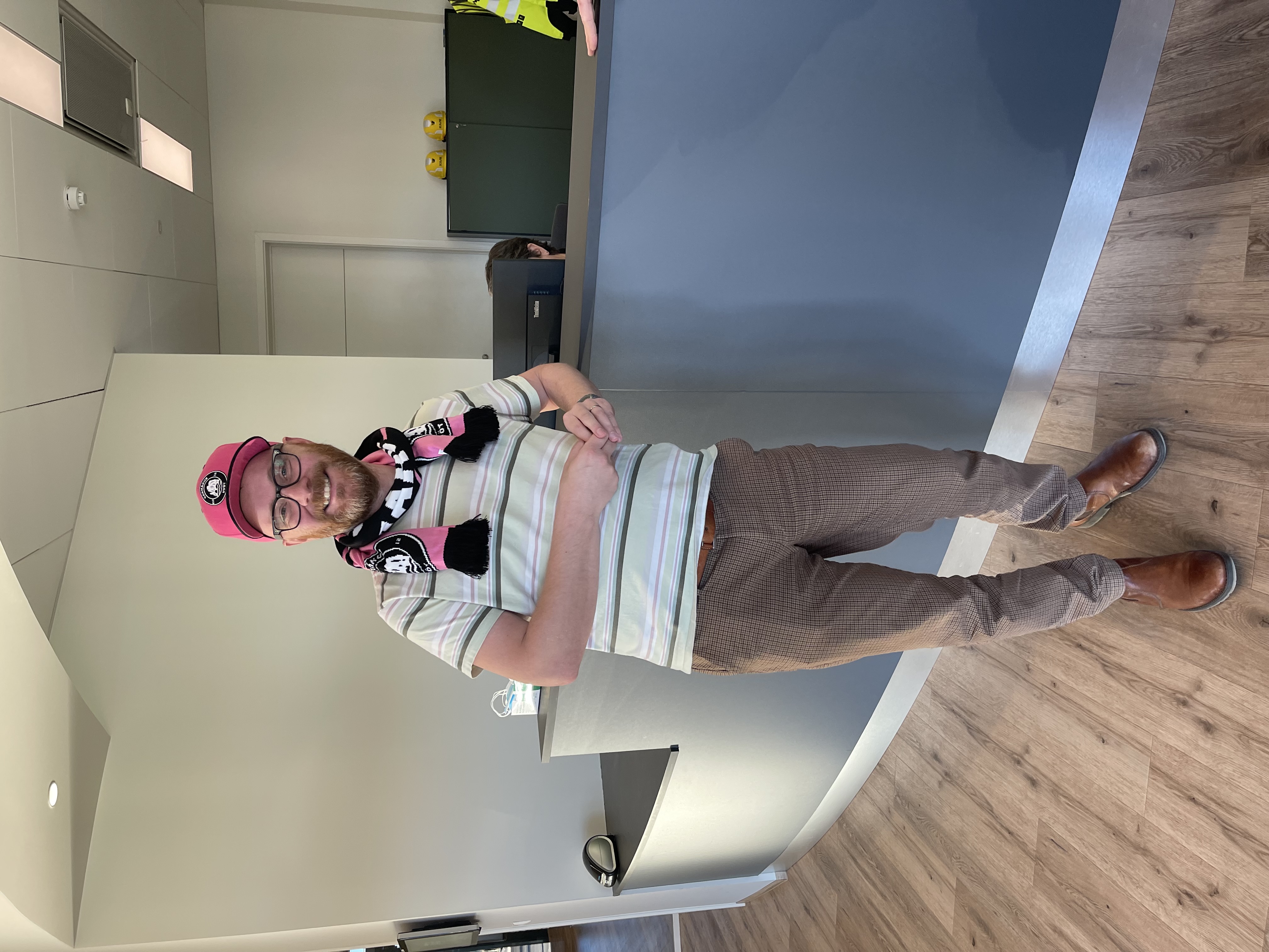 Að henni lokinni fórum við á fund með Vegagerðinni í höfuðstöðvunum í Suðurhrauni. Þar tóku Bergþóra Þorkelsdóttir, forstjóri og Guðmundur Valur Guðmundsson, framkvæmdastjóri þróunarsviðs á móti okkur. Áttum við góðar umræður um vegamál og eðlilega var Vatnsnesvegurinn nefndur nokkrum sinnum. Er þetta annar fundurinn með Vegagerðinni á mjög stuttum tíma enda er það mikið áhersluatriði sveitarstjórnar að gera allt sem hægt er til að hraða framkvæmdum við veginn hvort sem það er í gegnum samgönguáætlun eða nýstarlegri hugmyndum líkt og þeim sem kynntar voru í síðustu viku. Glöggir lesendur kannast líklega við Guðmund Val en hann er sonur Guðmundar Sigurðssonar sem starfað hefur um árabil á starfsstöð Vegagerðarinnar á Hvammstanga. Hann var ekki sá eini sem við hittum sem á ættir að rekja í Húnaþing vestra. Í anddyrinu rákumst við á mann sem var með Kormáks trefil og húfu. Engan annan en Björgvin Brynjólfsson. Við máttum til með að smella af honum mynd með þessa fallegu fylgihluti. Það er nú ekki svo að hann klæðist þeim alla jafna en þennan föstudag var bleikur dagur.