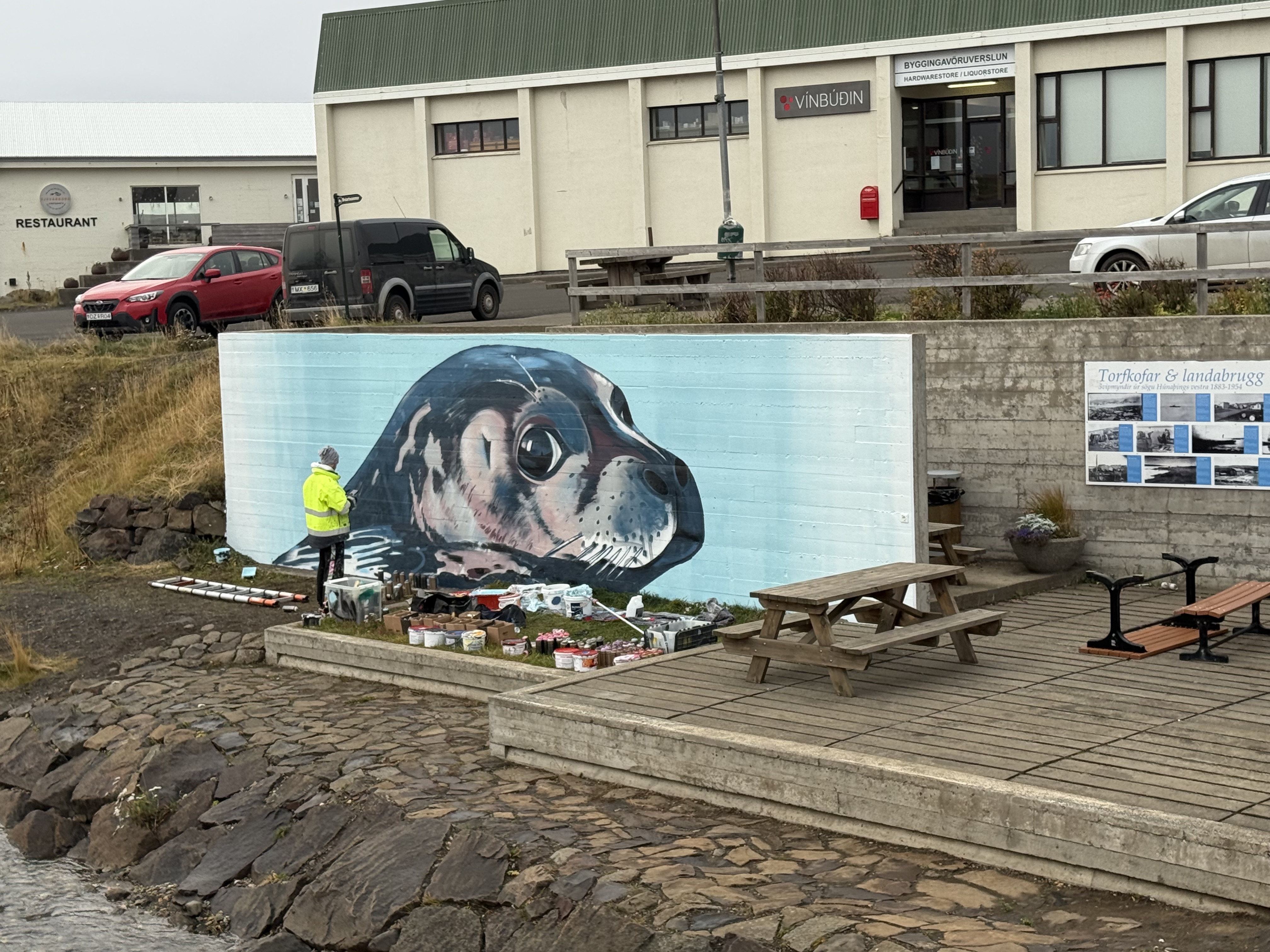 Fyrir helgina hóf vegglistamaðurinn Juan vinnu við listaverk á auða vegginn við Brúarhvamm. Hann vann fyrir okkur skreytingar á vigtarhúsið í fyrrasumar og við fengum hann til að fara með okkur í hugmyndavinnu vegna verks á fyrrnefndan vegg. Það sem okkur leist best á var stór mynd af sel sem tók á sig mynd yfir helgina og ég verð að segja fór fram úr mínum björtustu vonum. Juan er jafnframt að vinna fyrir okkur nokkurskonar ramma þar sem hægt verður að stilla sér upp og taka myndir, nokkuð sem er hægt að finna í mörgum sveitarfélögum í ýmsum myndum, svo sem hjörtu. Við hins vegar ætlum að gera okkar eigin útgáfu af myndaramma, úr rekavið sem okkur finnst einkennandi fyrir svæðið. Staðsetningin hefur ekki verið endanlega ákveðin en vinnan við verkið er hafið. Mjög spennandi allt saman en við fengum styrk úr styrktarsjóði Eignarhaldsfélags Brunabótafélags Íslands fyrir hluta kostnaðar við þetta hvoru tveggja. Ásýndin í sveitarfélaginu er afar mikilvægur þáttur í staðarandanum. Ég mun sannarlega halda áfram að leita styrkja til verkefna af þessum toga og tek fagnandi við öllum hugmyndum.