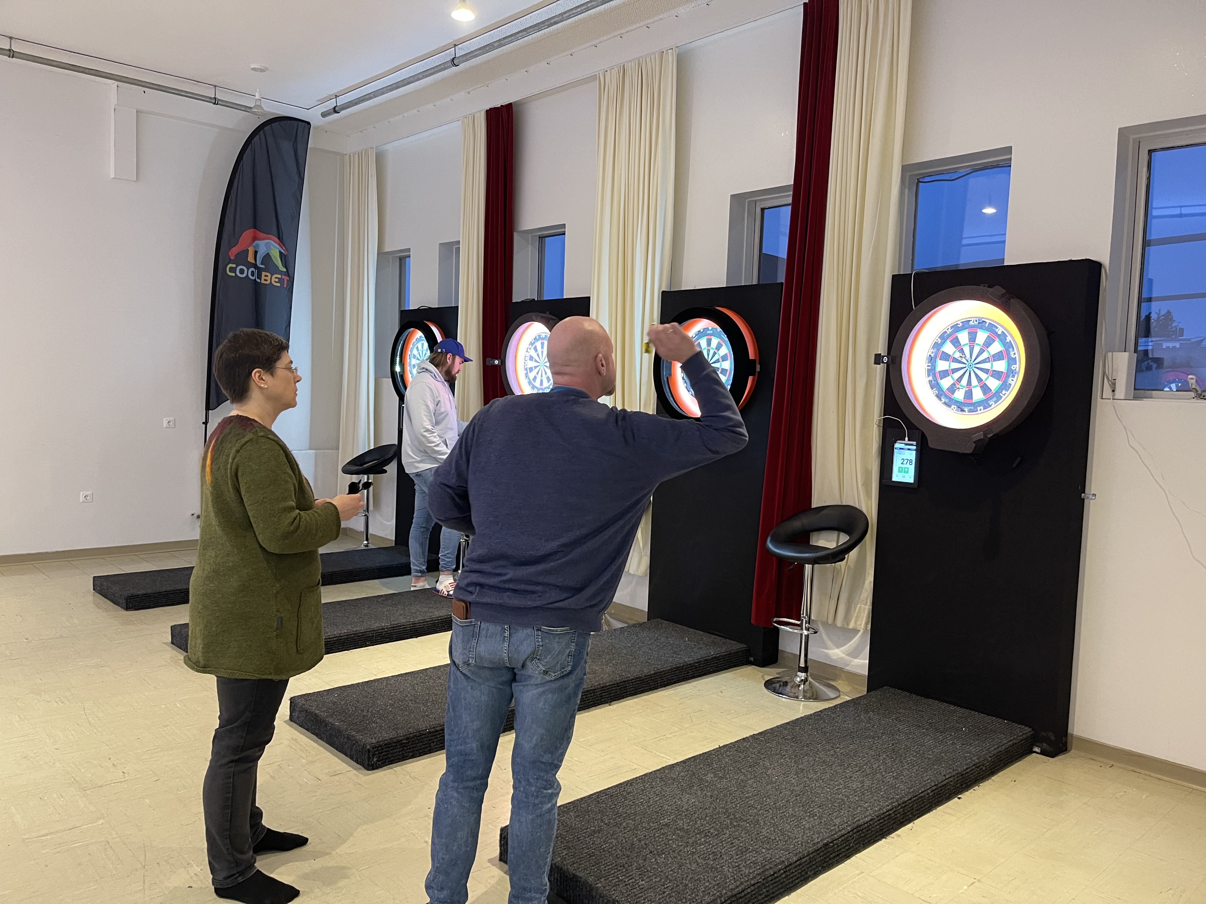 Henrike yfirfélagsráðgjafi og Bogi skipulagsfulltrúi einbeitt í pílukastinu.