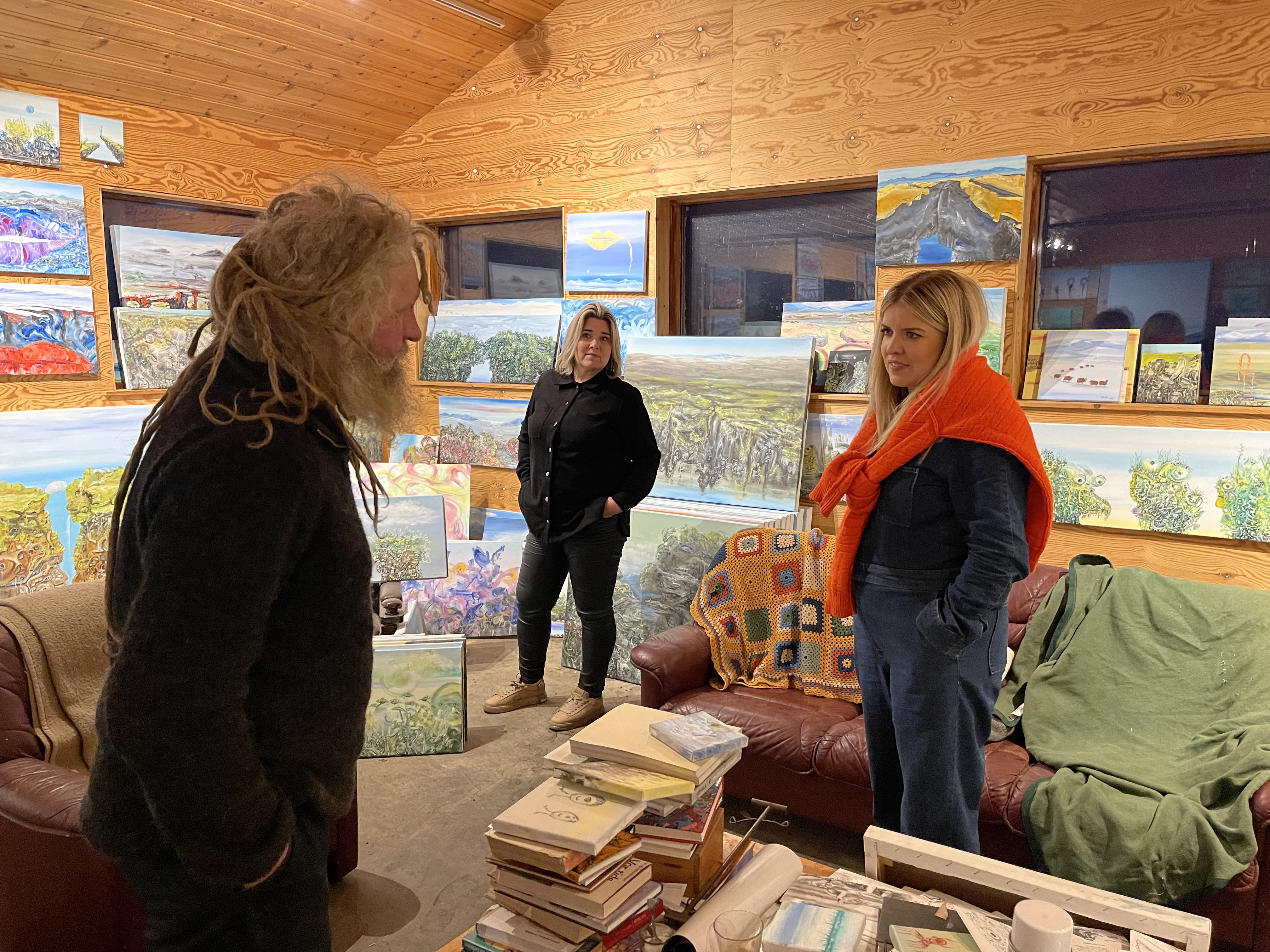 Jón á Búrfelli segir Áslaugu Örnu og Áslaugu Huldu frá verkum sínum á vinnustofunni.