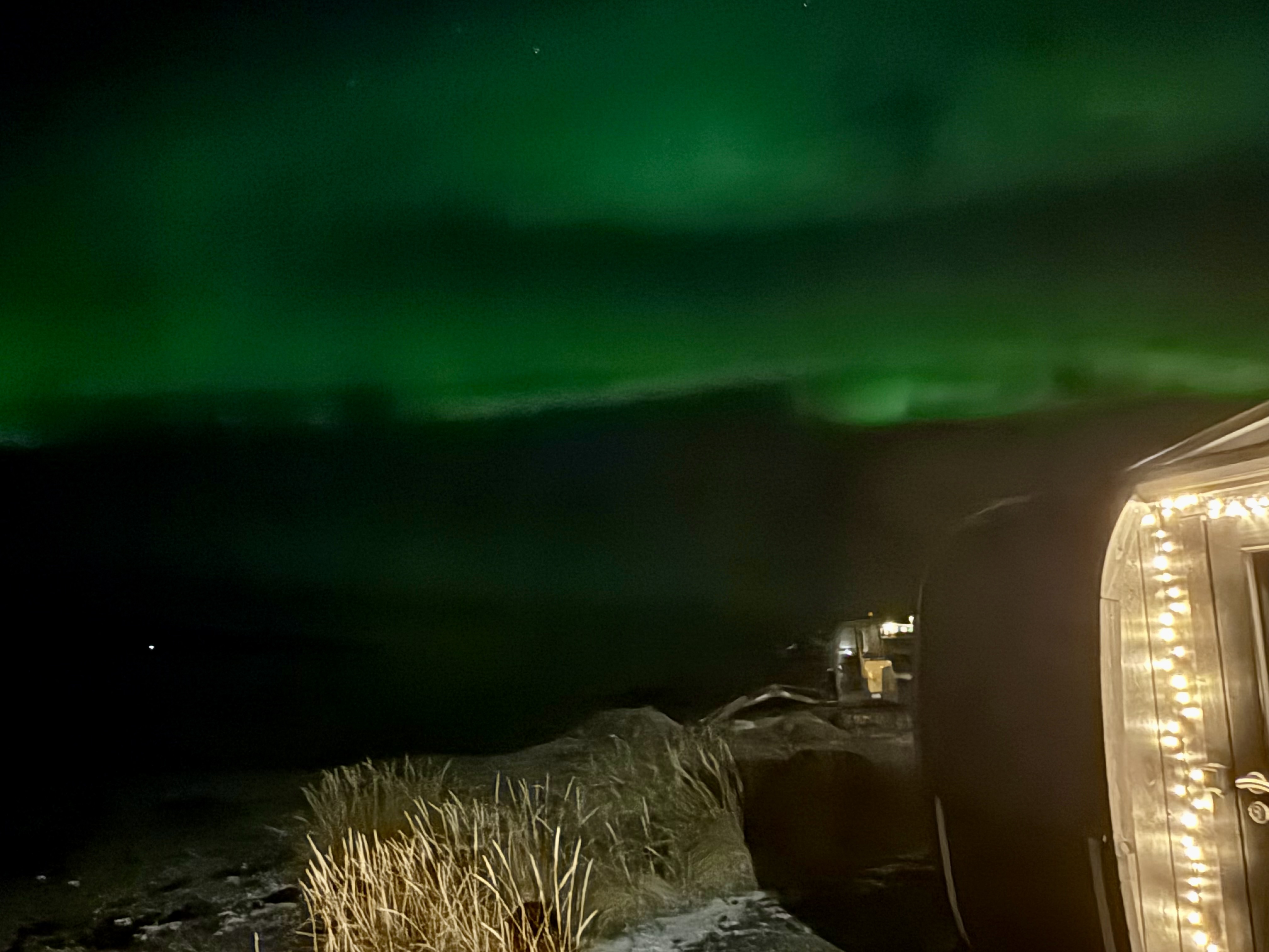Á fimmtudagskvöldinu fórum við hjónin í gusu hjá Sánasetrinu sem er nú ekki í frásögur færandi. Ég má bara til með að deila með lesendum þessari mynd sem ég tók að gusu lokinni þar sem við fengum svo falleg norðurljós í kaupbæti.