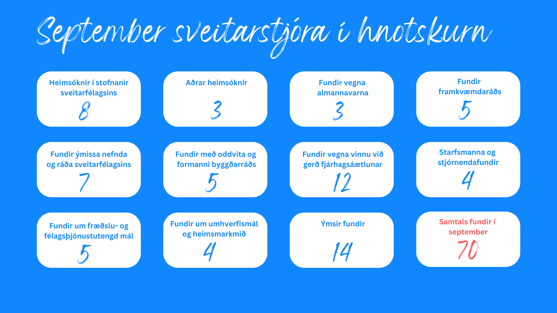 Til gamans fylgir hér smá samantekt yfir fundi septembermánaðar. Keppikeflið er alls ekki að halda sem flesta fundi. Þvert á móti ætti að reyna að fækka þeim eins og kostur er. Hins vegar er gagnlegt að taka upplýsingar sem þessar saman til að ná utan um í hvað tíminn er að fara. Vert er að taka fram að lengd þessara funda er afar mismunandi. Allt frá því að vera hálftími upp í tvo og hálfan dag. Einnig rata ekki inn á þessa samantekt ör fundir – eins og stutt spjall við starfsmenn eða gesti og gangandi.