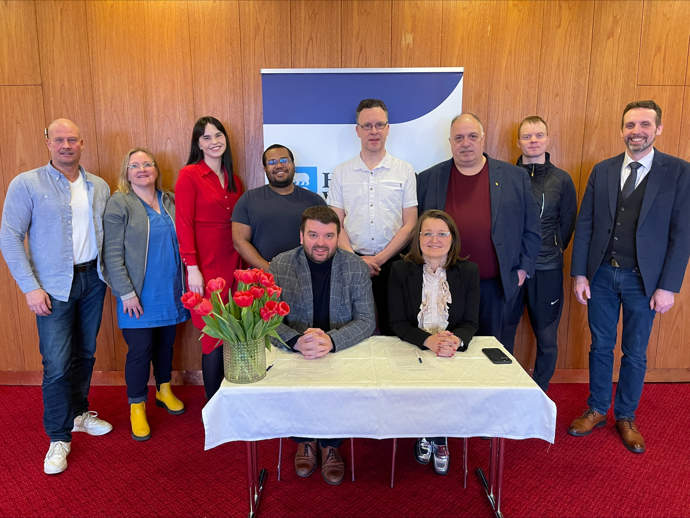 Frá undirritun samstarfssamningsins. Standandi frá vinstri: Stefán Vagn Stefánsson, formaður fjárlaganefndar, Halla Signý Kristjánsdóttir, þingmaður, Lilja Rannveig Sigurgeirsdóttir, þingmaður, Luís Aquino, fulltrúi Húnaklúbbsins, Magnús Magnússon, formaður byggðarráðs, Þorleifur Karl Eggertsson, oddviti sveitarstjórnar, Magnús Eðvaldsson, sveitarstjórnarfulltrúi og Sigurður Þór Ágústsson, sviðsstjóri fjölskyldusviðs. Sitjandi: Ásmundur Einar Daðason, mennta- og barnamálaráðherra og Unnur Valborg Hilmarsdóttir, sveitarstjóri.