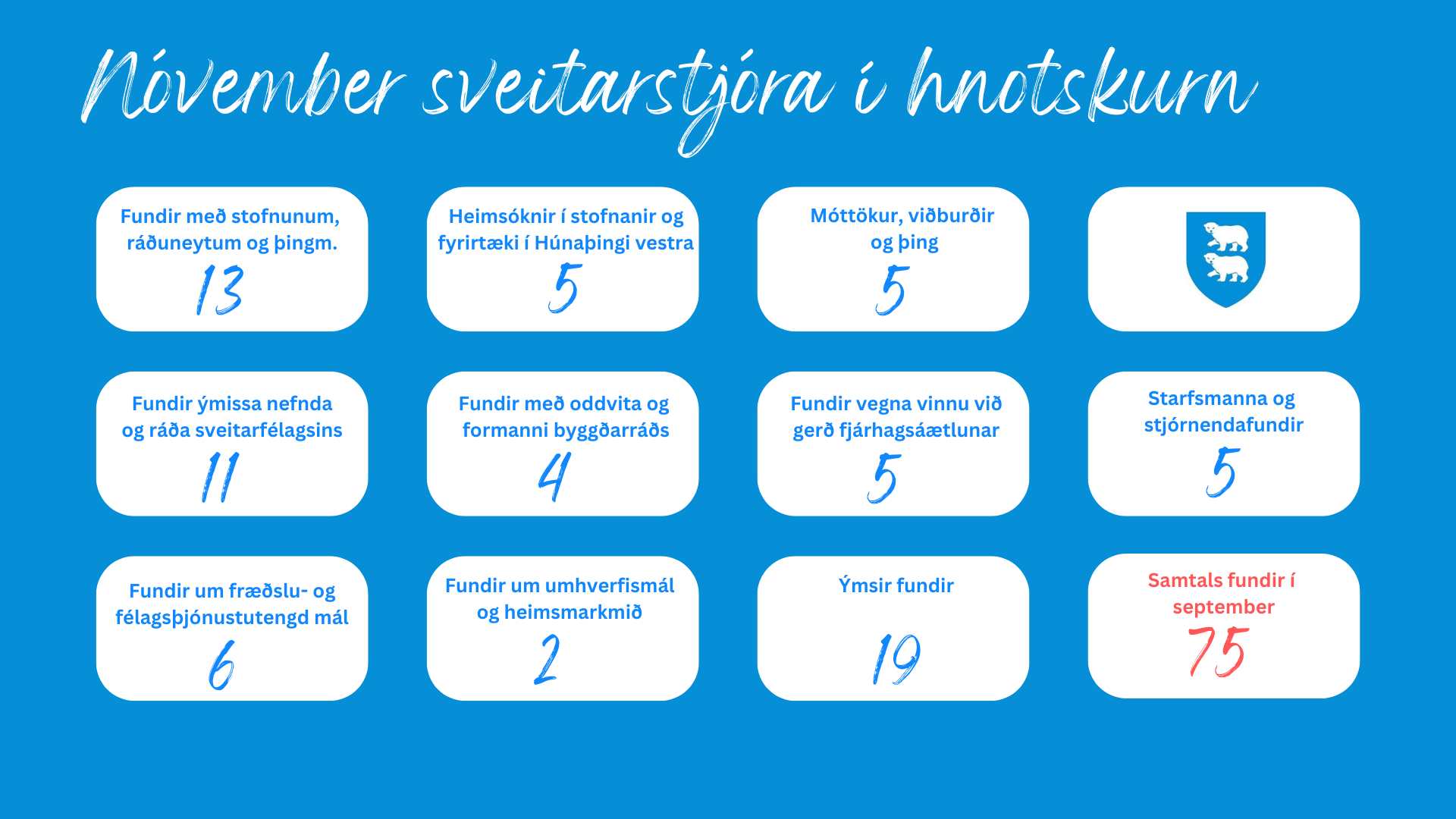 Við náðum þó ekki að njóta veitinganna með samstarfsfólki vegna stífra fundahalda en fyrsti fundur dagsins tengdist fjárhagsáætlunarvinnu. Aukið byggðarráð kom saman til að fara yfir stöðu áætlunargerðarinnar. Eftir fundinn sáum við fyrir endann á vinnunni við áætlunina þó vikan öll hafi verið undirlögð undir hana, sérstaklega hjá sviðsstjóra fjármála- og stjórnslusviðs. Fjárhagsáætlanir sveitarfélaga þurfa að fá tvær umræður í sveitarstjórn með að minnsta kosti tveggja vikna millibili. Gert er ráð fyrir að fyrri umræða fari fram á reglulegum fundi sveitarstjórnar 10. nóvember og síðari umræðan á aukafundi tveimur vikum seinna. Allt útlit er fyrir að þau áform gangi eftir þökk sé samstilltu átaki sviðsstjóra og forstöðumanna sveitarfélagsins. Samhliða fundi aukins byggðarráðs var haldinn aukafundur sveitarstjórnar til að ganga frá lokauppgjöri vegna skólabúðanna á Reykjaskóla og viðauka við fjárhagsáætlun vegna ýmissa liða hennar. Í kjölfar funda byggðarráðs- og sveitarstjórnar fundaði starfshópur um eignir og jarðir sveitarfélagsins í fyrsta skiptið og var farið yfir samantekt yfir eignirnar. Ýmsar spurningar komu upp sem við starfsmenn munum finna út úr á milli funda. Hópurinn á að taka saman heildaryfirlit yfir fasteignir, jarðir og lendur í eigu sveitarfélagsins. Leggja mat á þær, móta tillögu að framtíðarsýn um ráðstöfun þeirra og leggja fyrir sveitarstjórn. Erindisbréf hópsins er hér og fundargerðin hér.