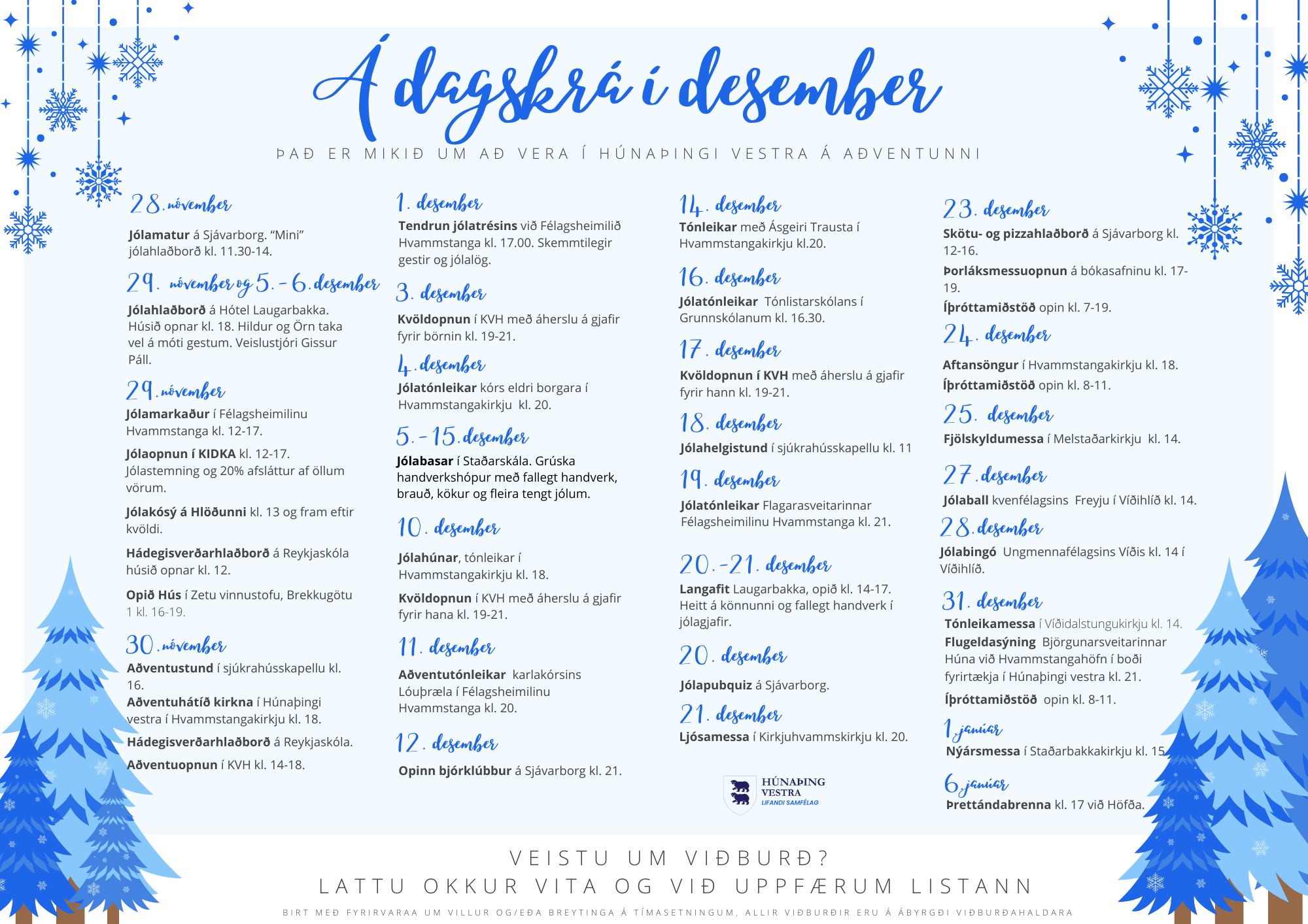Að vanda birtum við yfirlit yfir það sem um er að vera í sveitarfélaginu á aðventunni. Eins og vanalega er það ekkert smáræði, tónleikar, sérstakar opnanir verslana og veitingastaða, jólamarkaðurinn á sínum stað o.s.frv.  Reyndar nær dagskráin yfir í janúar því nýársmessan og þrettándabrennan eru á sínum stað. Yfirlitið er birt með fyrirvara um villur og eins má vera að það eigi eftir að bætast við viðburðir.