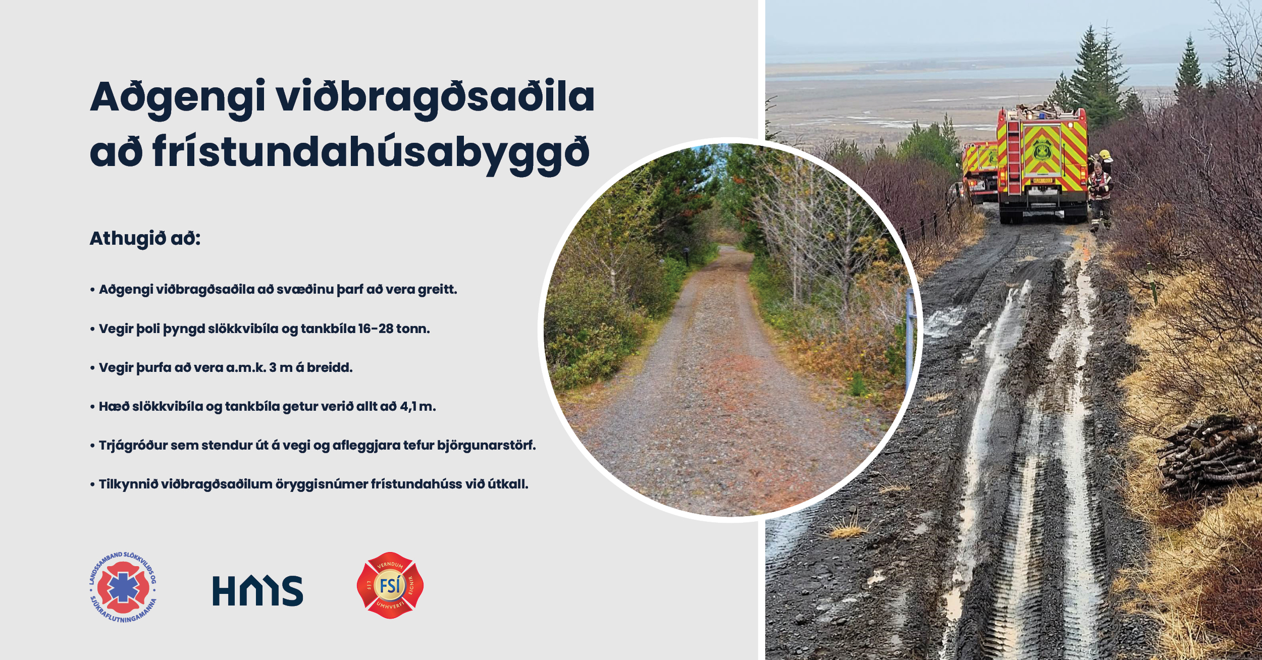 Viðbragðsaðilar og HMS hafa vekja athygli á mikilvægi þess að eigendur frístundahúsa tryggi aðgengi viðbragðsaðila að eignum sínum. Tryggja þarf að vegir þoli þyngd slökkvi- og tankbíla, breidd vega sé nægileg og að trjágróður hindri ekki aðkomu. Einnig er bent á að brýnt sé að gefa upp öryggisnúmer frístundahúss við útkall.
