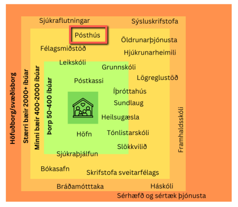 Í drögum að skilgreiningu á opinberri grunnþjónustu og jöfnun aðgengis sem birt voru til umsagnar í samráðsgátt stjórnvalda í lok árs 2023 eru settar fram tillögur að viðmiðum um nærþjónustu þá sem aðengileg ætti að vera í ákveðnum stærðum samfélaga. Þar er bæjum skipt upp í fjóra flokka, þorp með 50-400 íbúa, minni bæi með 400-2000 íbúa, stærri bæi með yfir 2000 íbúa og að síðustu höfuðborg/svæðisborg. Í Húnaþingi vestra eru í dag um 1250 íbúar þar af um helmingur búsettur á Hvammstanga. Sveitarfélagið fellur því í annan flokkinn, minni bæi með 400-2000 íbúa. Skv. skýringarmynd sem sýnir tillögu að stigum þjónustu sem þar er að finna skal vera pósthús í bæjum af þeirri stærðargráðu. Sjá mynd: