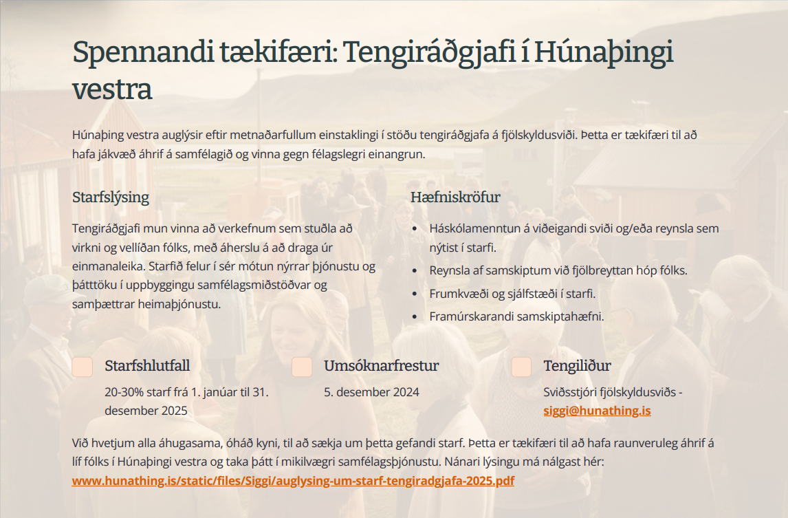 Húnaþing vestra leitar að öflugum og drífandi einstaklingi í tímabundið hlutastarf tengiráðgjafa á fjölskyldusviði sveitarfélagsins. Við leitum að aðila með brennandi áhuga á að starfa með viðkvæmum hópum og ýta undir velferð þeirra og vellíðan. Um er að ræða 20-30% starf frá 1. janúar 2025 – 31. desember 2025. Samkomulag er um hvernig vikulegri viðveru verður háttað.