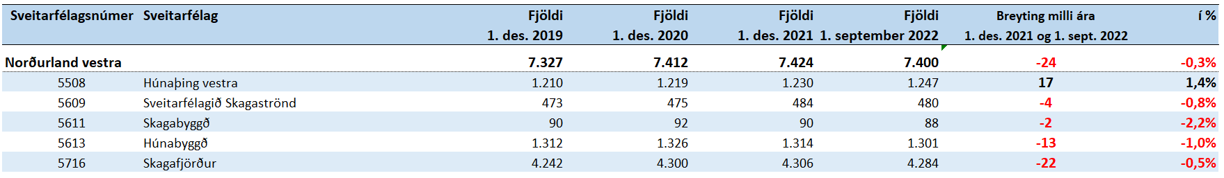 Hér að neðan má sjá töflu yfir íbúafjölda á Norðurlandi vestra á tímabilinu 1. desember 2019 til 1. september 2022.