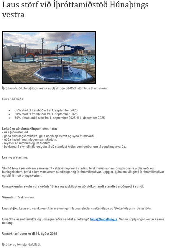 Þrjú störf eru laus við Íþróttamiðstöð Húnaþings vestra sjá meðfylgjandi mynd eða hér.