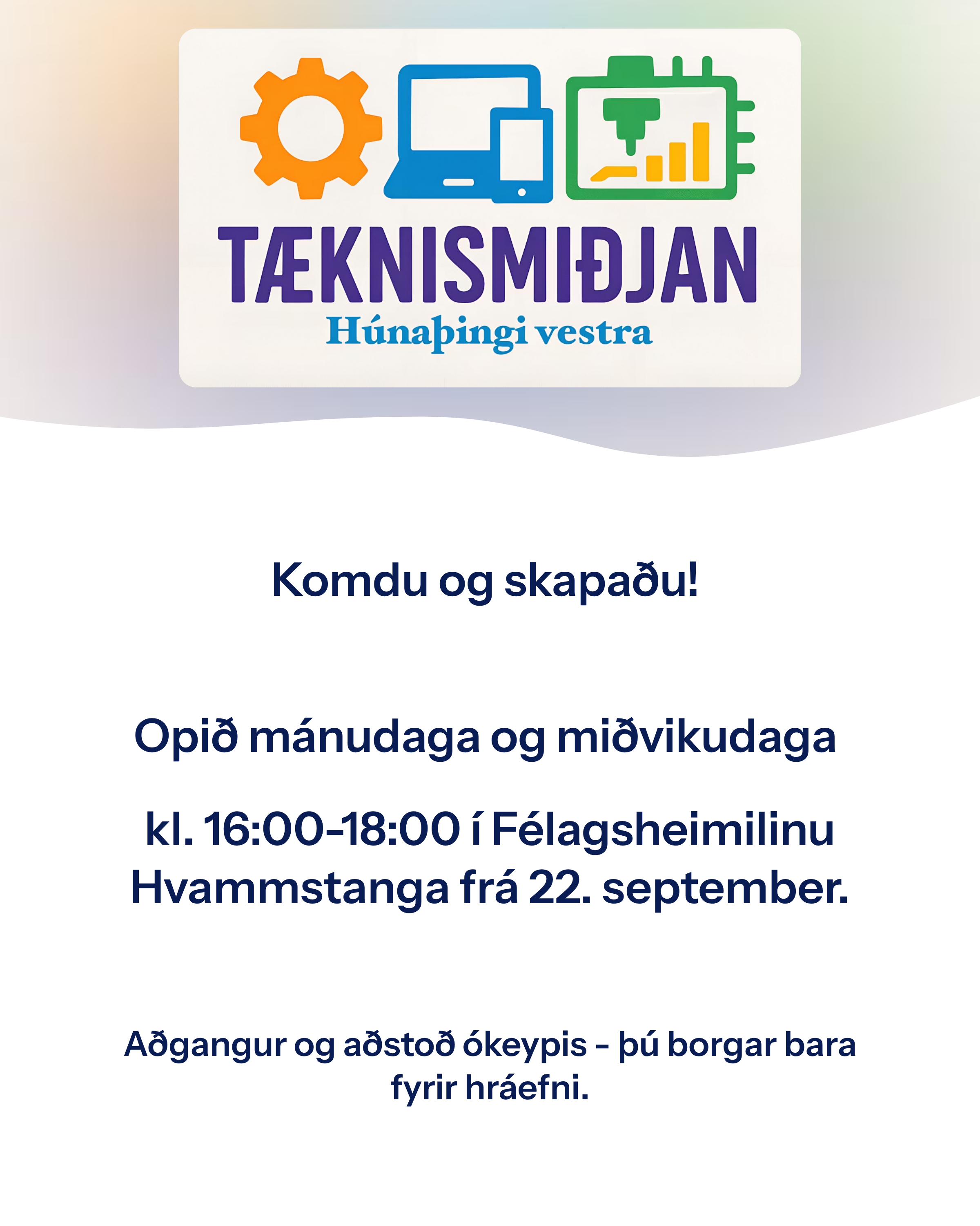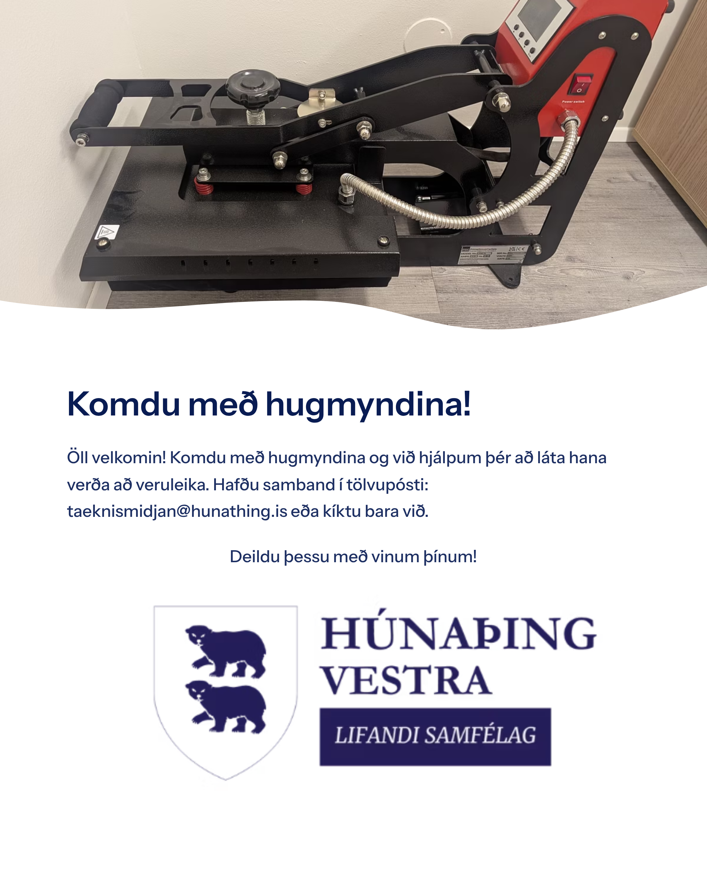 Hægt er að kíkja við eða fá upplýsingar í tölvupósti taeknismidjan@hunathing.is. Aðgangur og aðstoð er ókeypis en greitt er fyrir hráefni sem er notað.