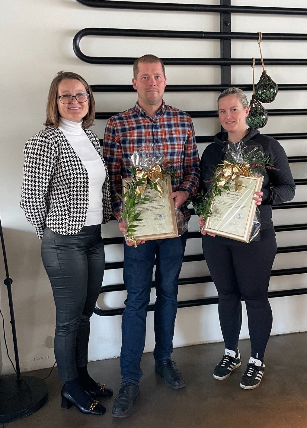 Guðrún Eik Skúladóttir og Óskar Már Jónsson á Tannstaðabakka veita viðurkenningunni viðtöku. Ólöf Ólafsdóttir var fjarverandi.