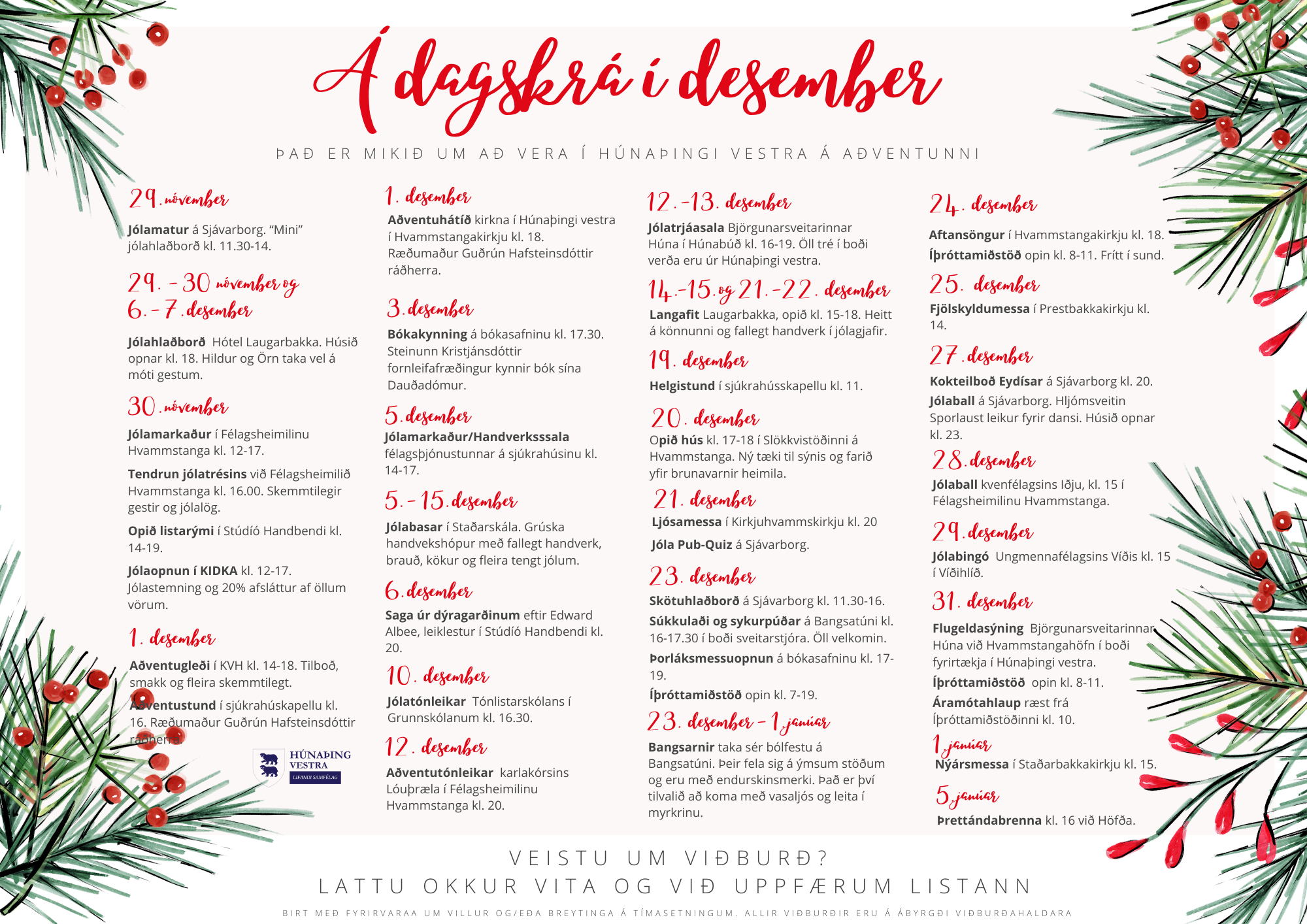 Eins og fyrri ár tökum við saman dagskrá yfir þá fjölmörgu viðburði sem á dagskrá verða í desember í Húnaþingi vestra. Listinn er aðgengilegur bæði hér að neðan og á facebook síðu sveitarfélagsins. Hann er uppfærður reglulega eftir því sem viðburðir bætast við. Eins og sjá má er af nægu að taka.