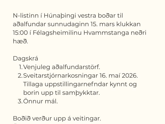 N-listinn í Húnaþingi vestra boðar til aðalfundar sunnudaginn 15. mars klukkan 15:00 í Félagsheimilinu Hvammstanga neðri hæð.
