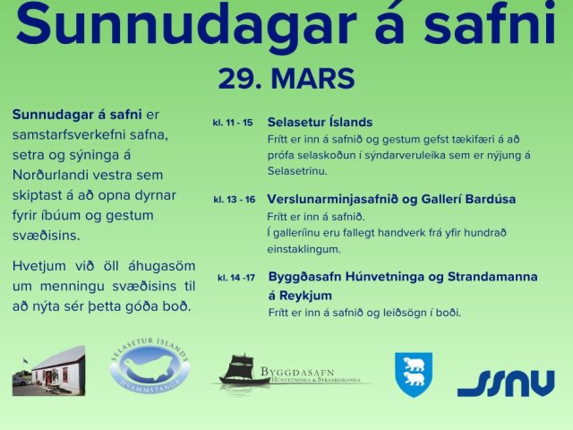 Sunnudagurinn 29. mars er svokallaður sunnudagur á safni en það er viðburður á vegum safna, setra og sýninga á Norðurlandi vestra. Í Húnaþingi vestra verða Selasetur Íslands, Verslunarminjasafnið og Gallerí Bardúsa og Byggðasafn Húnvetninga og Strandamanna opin.