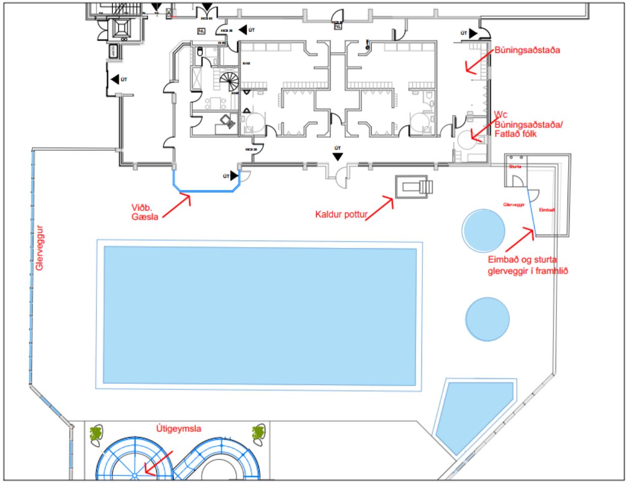 25m x 11m útilaug með fjórum brautum Heitur pottur með vatnsnuddi Vatnsrennibraut Barnavaðlaug Vaðlaug Kaldur pottur Gufubað Þvottavél og þurrkari til afnota Þrektækjasalur Minni salur fyrir hóptíma o.fl.