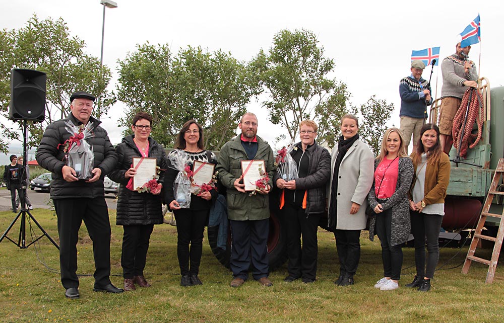 Unnur Valborg Hilmarsdóttir Oddviti Húnaþings vestra kynnti vinningshafa og Ína Björk Ársælsdóttir og Erla B. Kristinsdóttir fyrir hönd nefndarinnar afhentu viðurkenningarskjöl og forláta kertalukt í blíðskaparveðri á fjölskylduhátíðnni Eldi í Húnaþingi. Aðrir í nefndinni eru Sigríður Hjaltadóttir og Þorvaldur Böðvarsson.